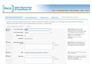 1) ORCID is a non-profit organization that launched in 2010 to create a central registry of researcher identities and link them to contributions such as publications, datasets, and patents.