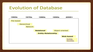 The document discusses object-relational and extended relational databases. It covers how an ORDBMS supports both relational and object-oriented aspects by allowing objects, classes, inheritance and other OO concepts in database schemas and queries. It provides examples of using ADTs and structured types to store complex data like videos more efficiently compared to a traditional RDBMS. Query processing and optimization techniques for ORDBMS are also discussed, such as user-defined aggregates, method caching and pointer swizzling.
