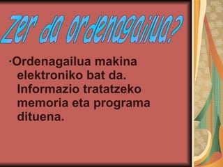 ·Ordenagailu izeneko makinabat behar da. ·Ordenagailuaren osagaiak hardwarea eta softwarea dira: Hardwarea. Ordenagailuaren atal fisikoa da. Hardwarea ordenagailuaren osagaien multzoa da Hardwarea