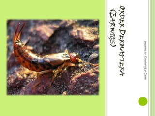 The document discusses the order Dermaptera (earwigs). It describes their key distinguishing characteristics such as their antennae, wings, abdominal segments, cerci, and life cycle. The order contains over 2,000 species divided among several suborders and families. While most earwigs are harmless, the European earwig is occasionally a pest to crops and plants. Earwigs are nocturnal and hide in cracks and crevices during the day.