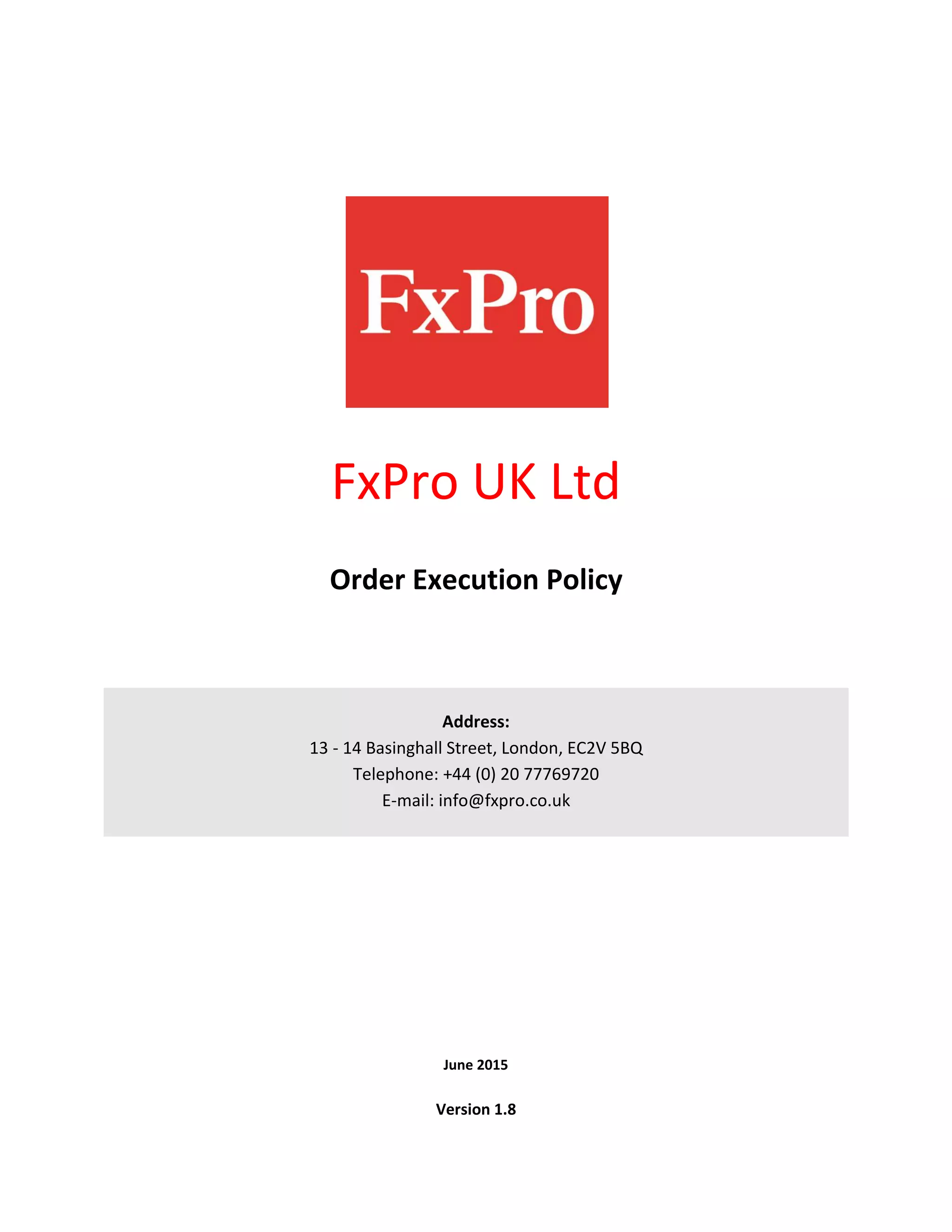 This document outlines FxPro UK Ltd's Order Execution Policy. It details FxPro's best execution obligations and how it executes different order types for its clients on the MetaTrader 4, MetaTrader 5 and cTrader platforms. The policy covers factors like price, costs, speed and likelihood of execution that FxPro considers when obtaining best execution. It also lists the execution venues and third party liquidity providers that FxPro uses to execute client orders.