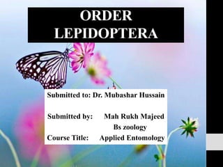 Order Lepidoptera includes butterflies, moths, and skippers. It is one of the largest insect orders, with over 180,000 described species worldwide. Lepidoptera undergo a complete life cycle of egg, caterpillar, pupa, and adult. As caterpillars, they are herbivorous, while adults feed on nectar and pollen. Some species are major agricultural pests, while others play important roles in ecosystems through pollination and nutrient cycling. Economically, silkworm moths produce silk, while other moths have been used for biological control. Major families include Nymphalidae, Papilionidae, and Noctuidae.