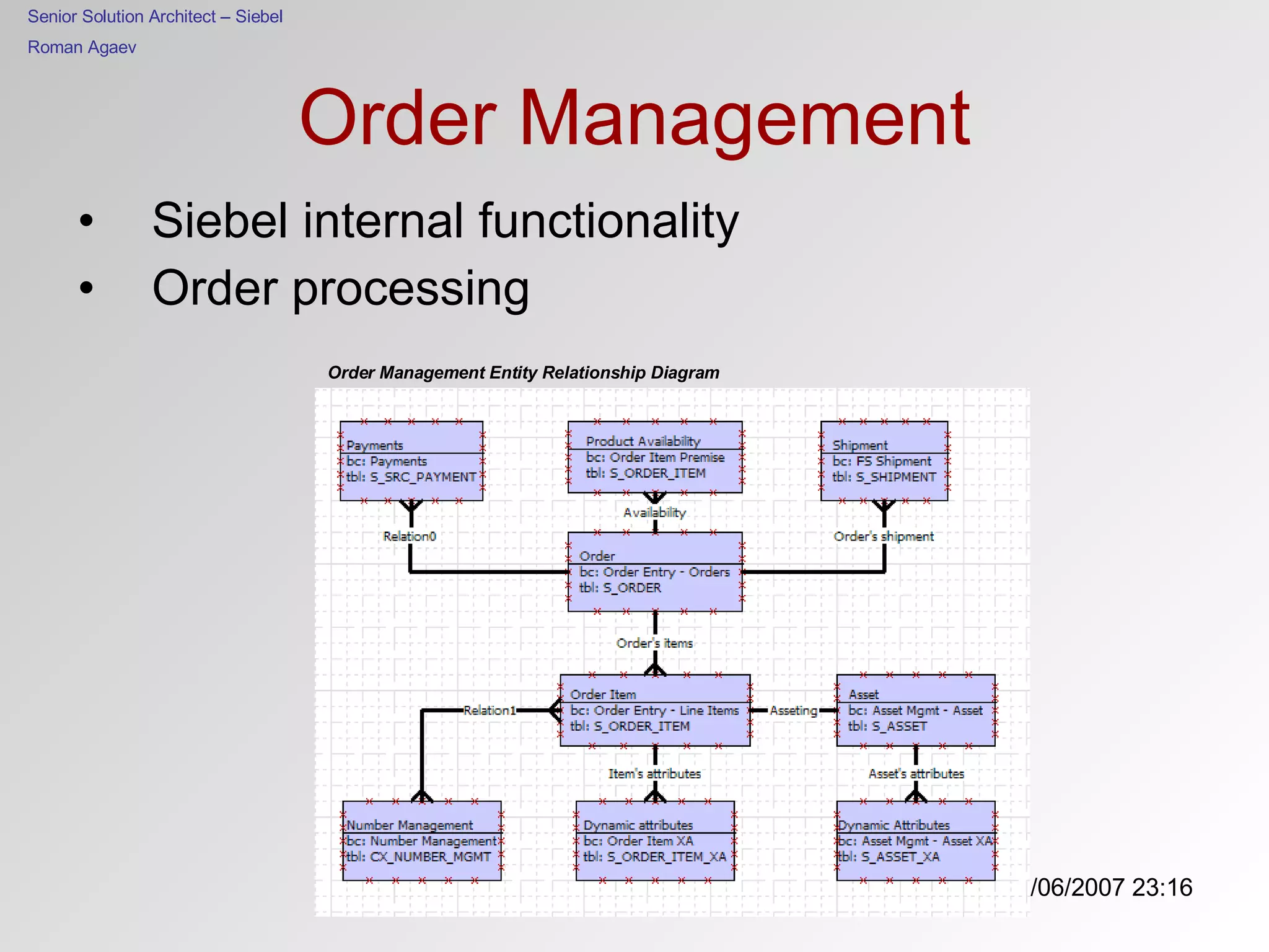 The document discusses order management functionality in Siebel including order verification, submission, and processing. Key aspects include product configuration checking, payment handling, and integrating Siebel with backend systems using TIBCO middleware for workflows. It also covers how Siebel models customers, accounts, assets and products in a hierarchical and relational manner.