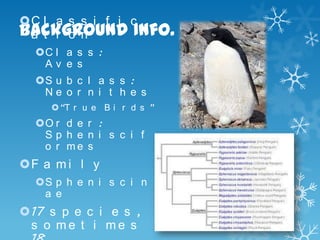 The document provides an overview of the classification and characteristics of penguins (order Sphenisciformes), including 17 to 18 recognized species and their habitats in the Southern Hemisphere. It specifically details the Adélie penguin, its physical description, diet, breeding behaviors, and nesting practices. Additionally, the document mentions the unique adaptations of penguins, such as their flightless nature and excellent swimming abilities.