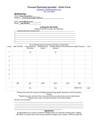 Meryl Dittenheimer ordered marketing services for one listing from Katherine Whelan. The services ordered include a $20 trial offer including listing upload, description and two status reports. An additional $10 per month was ordered for monthly exposure and $5 for agent promotion. The total due for the services is $25.