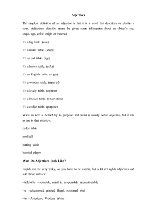 This document discusses the definition and positioning of adjectives in English sentences. It defines adjectives as words that describe or clarify nouns by providing information about attributes like size, shape, color, etc. It then discusses the typical order of multiple adjectives in English, with descriptors generally occurring before nouns in the order of quantity, quality, size, age, shape, color, origin, and purpose. The document provides examples of adjective ordering and exceptions where adjectives can follow nouns for emphasis. It concludes with an activity testing understanding of adjective ordering.