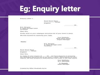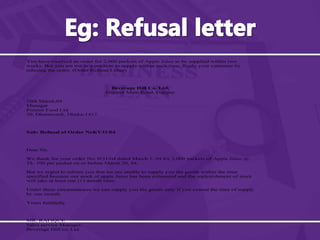 The document discusses various types of business letters related to ordering goods. It provides examples of acknowledgement letters, follow-up letters, confirmation letters, remittance letters, enquiry reply letters, order acknowledgement letters, stopgap letters, and refusal letters. Effective order letters are accurate, complete, and clearly understood to establish the relationship between buyer and seller.