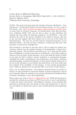 The document contains lecture notes for differential equations courses, covering topics such as basic concepts, linear and nonlinear equations, existence and uniqueness of solutions, and numerical methods. The notes are provided under a Creative Commons license and are intended for the author's students at California State University, Northridge, though others are free to use and distribute them. Feedback on errors or ways to improve the notes is welcomed.