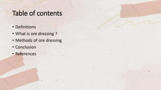 The document discusses the process of ore dressing, which involves separating valuable minerals from waste rock through various methods. Ore dressing begins with comminution to break ore into smaller pieces through crushing and grinding. This is followed by classification to separate particles based on size and density using equipment like air classifiers, rake classifiers, and hydrocyclones. The goal of ore dressing is to extract and concentrate valuable minerals from raw ore in an economically viable way while addressing environmental factors.