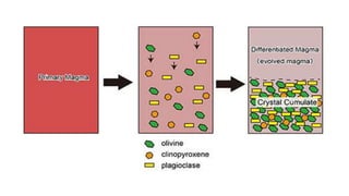 The document discusses three main types of ore forming processes: magmatic, sedimentary, and metamorphic. It focuses on magmatic processes, describing early and late magmatic processes like dissemination, segregation, injection, and residual liquid segregation and injection. Immiscible liquid segregation and injection are also discussed. Pegmatite deposits and contact metasomatic deposits near invading magmas are summarized. A variety of ore deposits can form from these magmatic processes depending on temperature and pressure conditions during crystallization and cooling of magma.