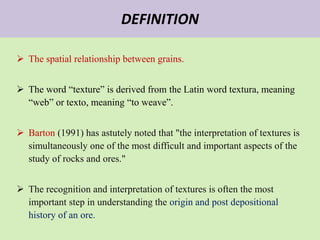 This document discusses rock textures in ores and their significance. It defines texture as the spatial relationship between grains. Primary textures form during initial ore deposition from melts or in open spaces, while secondary textures result from processes like replacement, cooling, deformation, and annealing. Specific primary textures include euhedral crystals from melts and growth zoning in open spaces. Replacement forms pseudomorphs and exsolution creates intergrowths. Deformation causes features like twinning, kink bands, and brecciation. Together, textures provide clues about an ore's depositional history and post-depositional changes. Careful study of textures is important for understanding ore genesis and evolution.