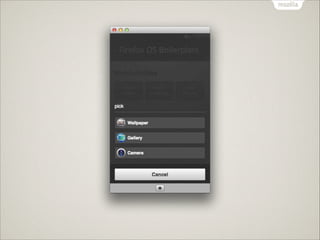 The document presents an overview of Firefox OS, emphasizing its target towards emerging markets and its reliance on HTML5, which offers simplicity and standardization. It discusses various hardware partnerships, application architectures, and key web APIs available for developers, including permissions and certified app features. Additionally, it highlights resources for app development and the promising future of Firefox OS as an alternative to closed platforms.