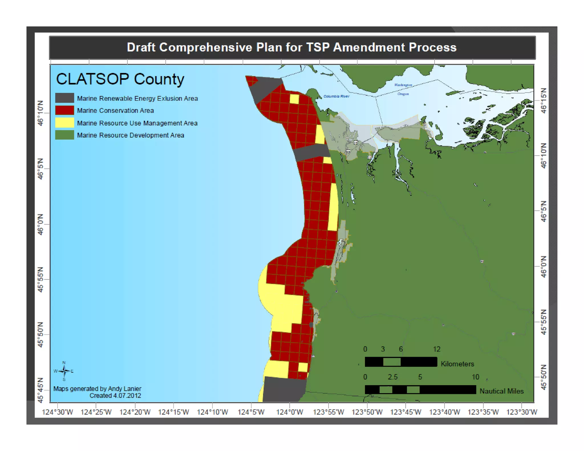 The document provides an overview of Oregon's marine spatial planning process. It discusses how the state developed its ocean management program through various executive orders and legislation over the past decade. Key aspects of the program include protecting renewable ocean resources like living marine organisms as outlined in the statewide planning goal 19, and establishing ocean management goals and authorities through the Ocean Policy Advisory Council and territorial sea plan. The document outlines Oregon's biogeographic assessment approach used to define areas protected by goal 19 and provides examples of spatial analysis tools and products used to aid marine resource management.