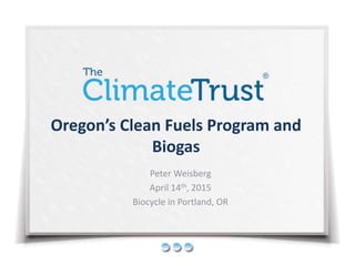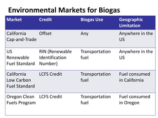 The document discusses Oregon's Clean Fuels Program and its relation to biogas, highlighting the program's goals of reducing carbon intensity in transportation fuels and the involvement of Washington State in similar initiatives. It outlines the carbon intensities of various fuels, the impact of California's Low Carbon Fuel Standard (LCFS), and the market dynamics for biogas credits. Key challenges include project financing and the volatile nature of the LCFS market.