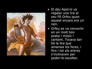 El déu Apol·lova regalar una lira al seu fill Orfeu quan aquest encara era un nen. Orfeu es va convertir en un molt bon poeta i músic i cantant. Tocava tan bé la lira que amansia les feres, i fins i tot els arbres s'inclinaven per poder-lo escoltar.
