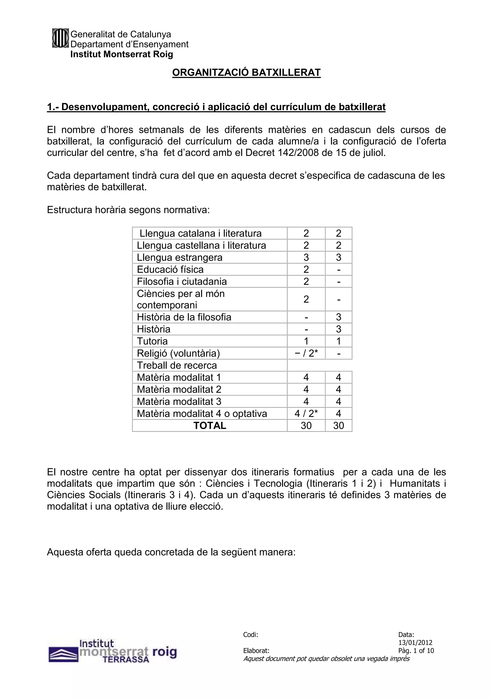 ORGANITZACIÓ BATXILLERAT