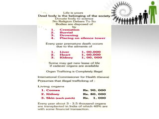 The document discusses organ donation in India, noting that over 500,000 people die each year due to the lack of organ donors. It explains that organ donation can occur from both living and deceased donors, with deceased donation allowing for more organs to be donated depending on whether the donor experienced brain death or cardiac death. The document advocates for more people to pledge to donate their organs after death in order to help save lives.