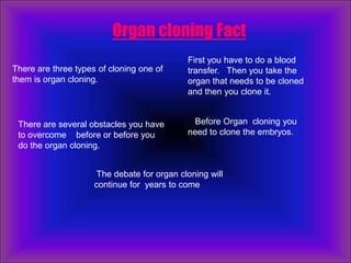 Organ cloning involves creating organs without removing them from another organism's body. It could help address the shortage of organs available for transplant. However, organ cloning faces several challenges. Fewer than 10% of organ cloning attempts have been successful so far, and cloned organs may not function identically to natural organs. There are also ethical concerns about organ cloning that remain unresolved. Overall, while organ cloning aims to save lives by providing transplantable organs, the technology is still experimental and not proven to be completely safe or effective.