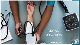 Organ donation involves transferring organs from a donor to a recipient to improve health. In India, approximately 500,000 people die annually due to a lack of available organs, with a significantly low donation rate compared to western countries. Challenges in organ donation include bureaucratic hurdles, a lack of awareness, and difficulties in family acceptance regarding brain death.