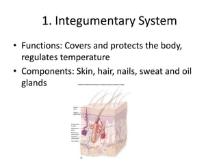 The document outlines the 11 major organ systems of the human body, describing their functions and main components. The systems are: 1) integumentary, which covers and protects the body; 2) skeletal, which provides structure and support; 3) muscular, which produces movement; 4) nervous, which senses stimuli and coordinates activities; 5) endocrine, which regulates metabolism via hormones; 6) cardiovascular, which transports blood; 7) lymphatic, which defends against disease; 8) digestive, which breaks down food; 9) respiratory, which exchanges gases; 10) urinary, which removes waste; and 11) reproductive, which creates offspring. The document concludes by assigning students lab groups to create skits about