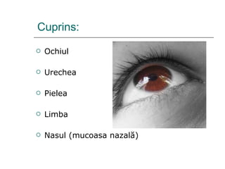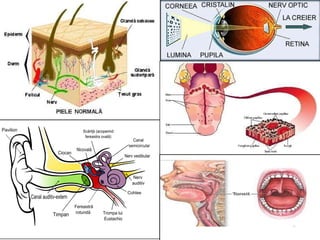 Documentul descrie organele de simț, incluzând ochii, urechile, pielea, limba și nasul, explicând structura și funcția fiecăruia. Ochiul este responsabil de vedere, urechea de auz și echilibru, pielea de protecție și termoreglare, limba de gust, iar nasul servește la respirație și olfacție. De asemenea, sunt menționate diverse boli asociate fiecărui organ de simț.