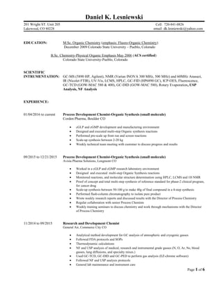 Daniel K. Lesniewski has over 15 years of experience in organic synthesis, analytical chemistry, and process development. He holds an M.Sc. in Organic Chemistry from Colorado State University-Pueblo and a B.Sc. in Chemistry from the same institution. His experience includes positions at Corden Pharma, Avista Pharma Solutions, General Air, Amgen, Lexmark International, and Colorado State University, where he has experience in multi-step organic synthesis, analytical instrumentation, scale-up reactions, method development, and research.