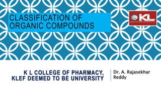 The document discusses the classification of organic compounds. Organic compounds are made up of carbon chains that can be open, closed in rings, or aromatic. Organic compounds can be classified based on their structure as acyclic/open chain, alicyclic/closed chain, or aromatic. They can also be classified based on functional groups into homologous series that have the same functional group but differ by CH2 units, such as alkanes, alkenes, alkynes, and others. The classification schemes are important for understanding the variety of organic compounds.