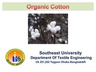 This document discusses organic cotton. It begins by defining organic cotton as cotton grown without insecticide or pesticide using low impact methods. It provides statistics on organic cotton production, noting that India produces over 3/4 of the world's organic cotton. It describes the chemical structure of organic cotton and its physical properties. It outlines advantages of organic cotton such as environmental protection and disadvantages like higher costs. It concludes by describing uses of organic cotton in various textile products and potential future applications.