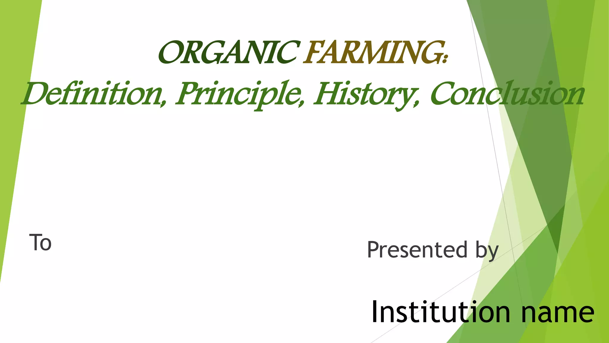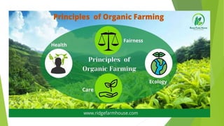 This document defines organic farming as a system that avoids synthetic inputs like fertilizers and pesticides and relies on practices like crop rotation and animal manures. It outlines the principles of organic farming as promoting health, ecology, fairness and care. The history of organic farming in India is discussed, noting it began in the early 1900s and states like Sikkim and Uttaranchal have been declared organic. Key differences between conventional and organic farming are less pollution and higher soil fertility with organic methods. The conclusion is that organic farming is a sustainable, eco-friendly approach that improves soil and yields quality produce.