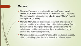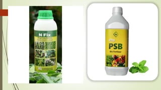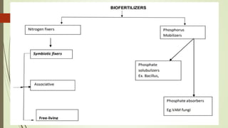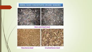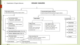 This document provides an overview of organic fertilizers, including their classification and identification. It discusses various types of organic fertilizers such as bulky organic manures (e.g. farm yard manure, compost, green manures), concentrated organic manures (e.g. oilcakes, bone meal), and industrial and human wastes that can be used as fertilizers (e.g. press mud, night soil). For each type, it provides examples and describes how they are produced and their nutrient content. The document also briefly discusses biofertilizers and their advantages in agriculture.