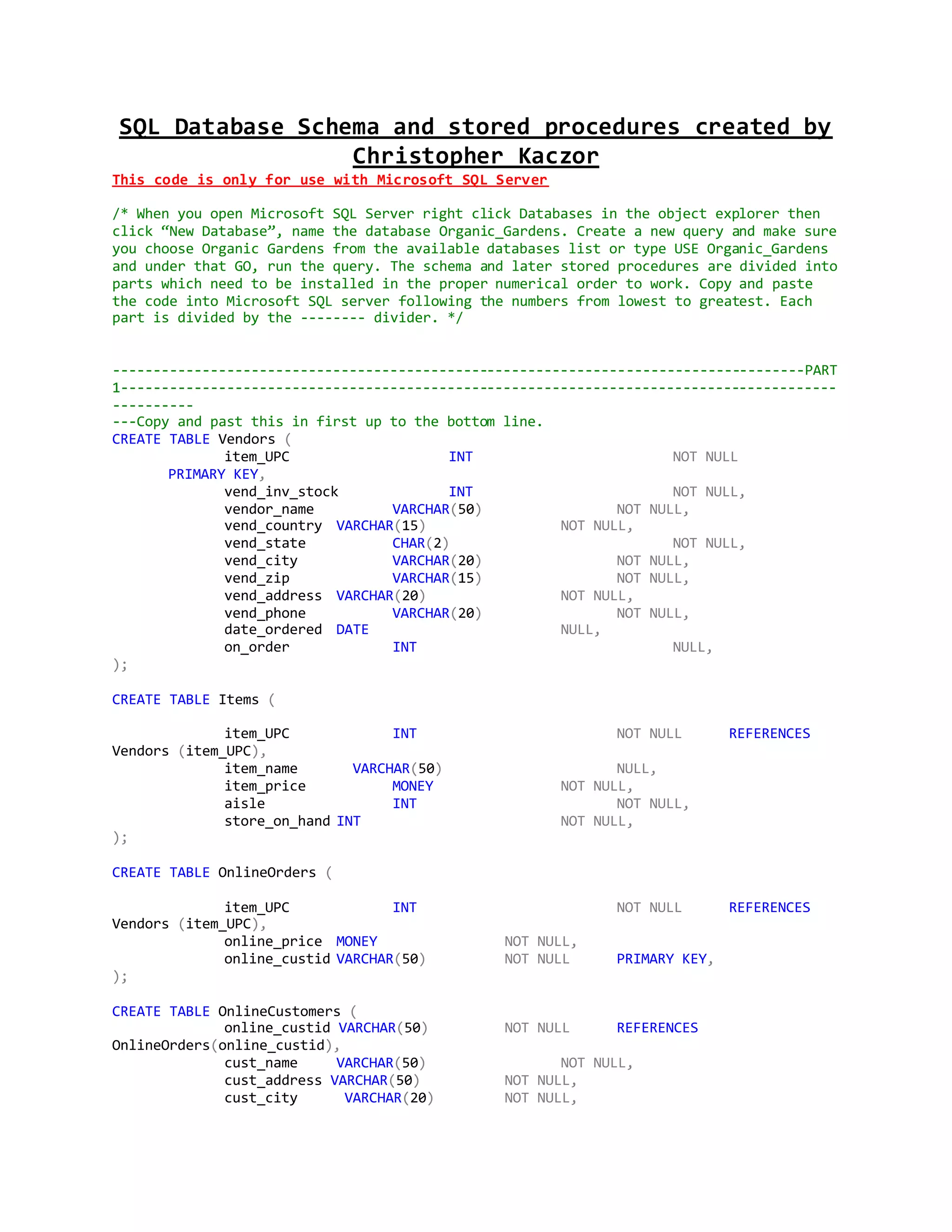 This document contains the SQL database schema and stored procedures created by Christopher Kaczor to be used with Microsoft SQL Server. It divides the code into 9 parts which need to be copied and pasted into SQL Server in numerical order to properly create the database tables, stored procedures, and populate the data. The code creates tables for vendors, items, online orders, and online customers and stored procedures to add data to each table. It also includes some additional stored procedures for analyzing order data.