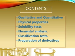 This document provides information on qualitative organic analysis including: