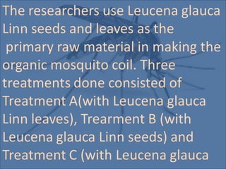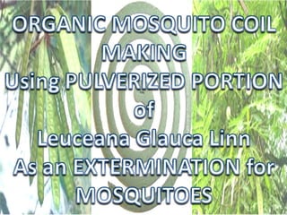 Mosquitoes carry diseases like dengue, so researchers developed organic mosquito coils from pulverized Leucena glauca Linn leaves and seeds to exterminate mosquitoes. The coils were tested on mosquito larvae cultured for 7-10 days in different containers. Coils with leaves killed 6/10 mosquitoes, coils with seeds killed 9/10 mosquitoes, and coils with both killed 9/10 mosquitoes, similar to commercial coils which killed 10/10 mosquitoes. Statistical analysis found no significant difference in the physical properties or effectiveness of the organic coils compared to commercial coils.