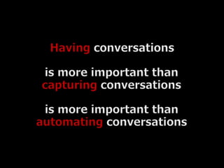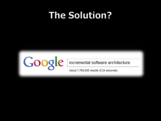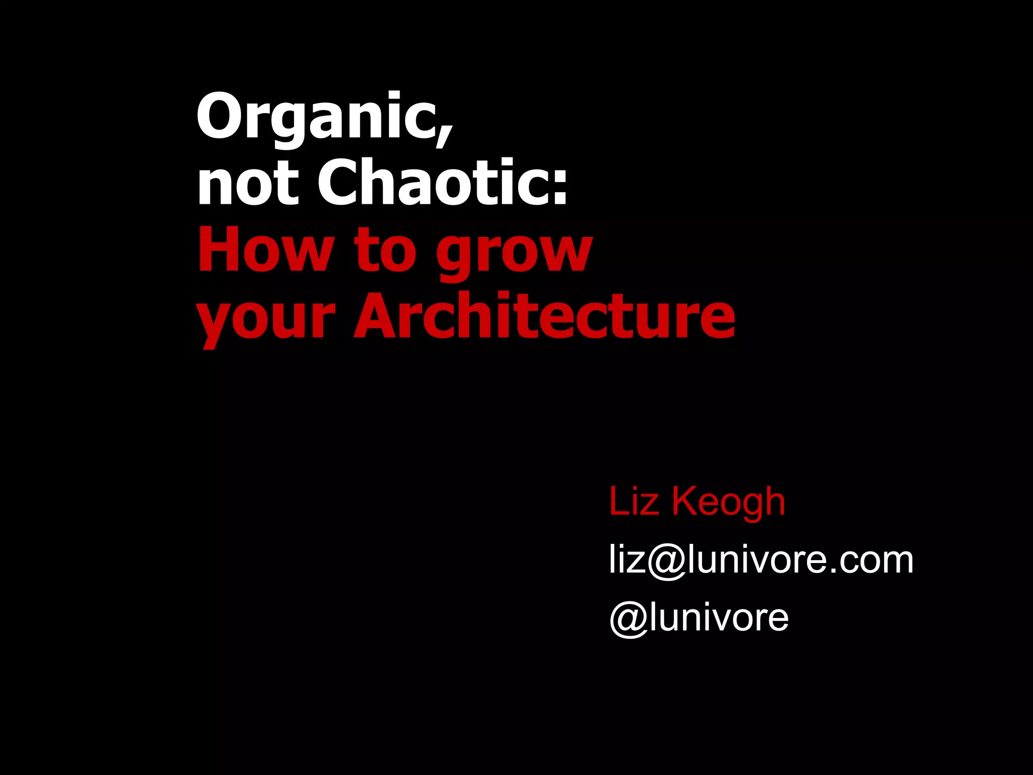 Organic, not Chaotic: How to grow your Architecture provides strategies for developing architecture in an organic way to avoid chaos. It suggests having architects, developers, and testers work together using deliberate discovery skills to reduce rework. Architects should create strategic plans and test architectural constraints while developers address tactical problems to evolve new plans together. Options should only be committed to if there is an understanding of their value and expiration. Communication and collaboration between roles is key to growing architecture successfully.
