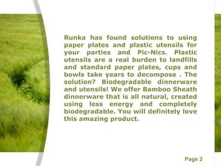 Runka offers various biodegradable and compostable dinnerware and utensil alternatives to plastic items that burden landfills. This includes bamboo dinnerware that is naturally sourced and uses less energy, as well as "Leafware" plates and bowls made from fallen palm leaves. They also provide compostable plates made from wheat straw and utensils made from non-GMO corn that fully degrade. All of the options aim to provide eco-friendly and sustainable replacements for disposable plastic products.