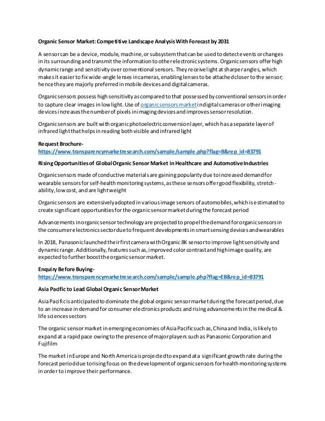 The organic sensor market is expected to grow significantly by 2031, driven by high sensitivity and dynamic range compared to conventional sensors, primarily in mobile devices and digital cameras. Key applications are emerging in healthcare and automotive industries, particularly with wearable sensors, due to their flexibility and cost-effectiveness. The Asia Pacific region is predicted to lead the market, bolstered by demand for consumer electronics and advancements in medical technology.