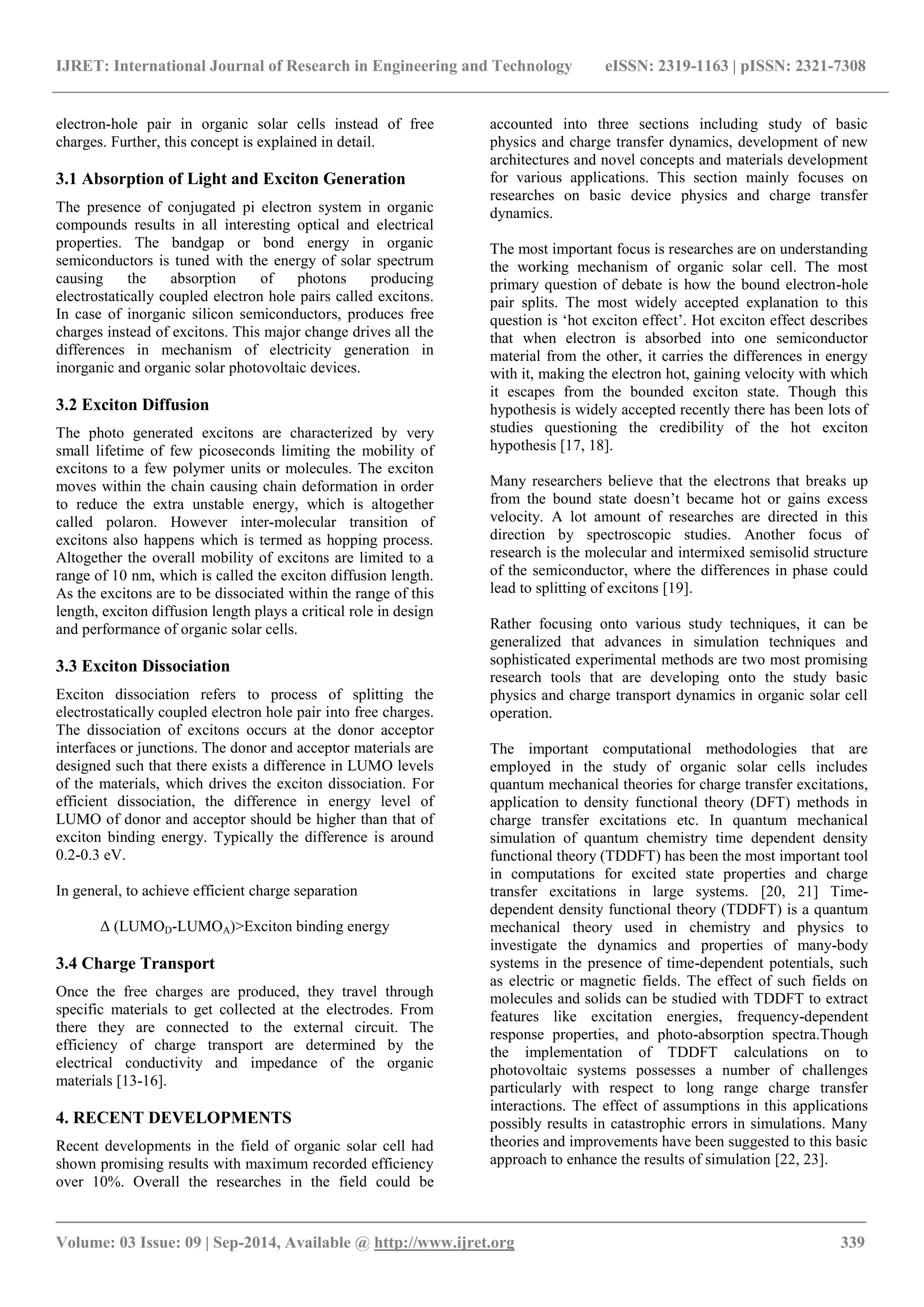 This document summarizes recent developments in organic solar cell technology. It discusses how organic solar cells work by generating electron-hole pairs called excitons when light is absorbed. Excitons must dissociate at donor-acceptor interfaces to generate free charges. There is ongoing research to better understand the mechanism of exciton dissociation. Computational methods like time-dependent density functional theory are being used to simulate charge transfer processes. Experimental research focuses on spectroscopic analysis to study conversion processes in picosecond timescales. Recent efficiency improvements and new device architectures are driving the commercial potential of organic solar cells.