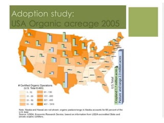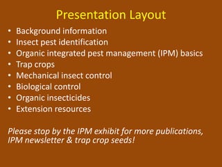 The document discusses various methods for organic insect pest management, including identification techniques and integrated pest management (IPM) strategies. It highlights the significance of trap crops, mechanical controls, biological controls, and organic insecticides in managing pests effectively. The presentation also emphasizes the role of natural enemies, research on effective insecticides, and the importance of scouting and monitoring pest populations.