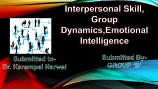 The document discusses interpersonal skills, group dynamics, and emotional intelligence. It defines these terms and discusses their importance. Interpersonal skills include communication, social and cooperation abilities. Group dynamics examines how groups are formed and function. Emotional intelligence involves recognizing one's own and others' emotions to guide thinking and actions. Developing interpersonal skills, understanding group dynamics, and increasing emotional intelligence can help managers and organizations succeed.