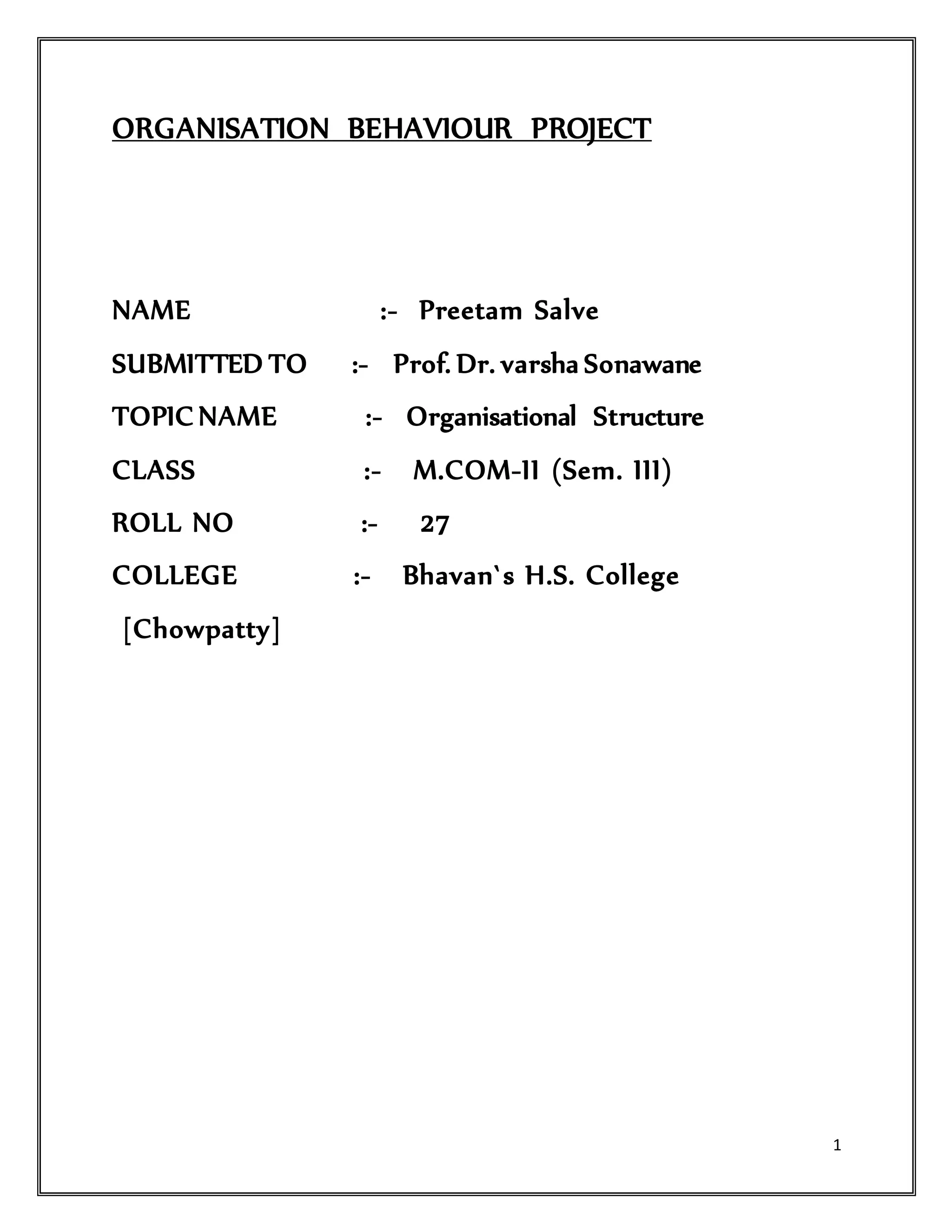 This document is a project report submitted by Preetam Salve to Prof. Dr. Varsha Sonawane on the topic of organizational structure. It includes a declaration, certificate, acknowledgements, and index sections. The introduction provides definitions of key terms like company, corporation, and organizational structure. The review of literature section summarizes several academic sources on organizational structure and the relationship between structure and public relations roles. The objectives of the study are to understand organizational structure, management, design, and corporate strategies. The research methodology uses secondary data sources. The report then discusses functional organizational structure, its strengths in allowing specialization, and weaknesses in coordination.