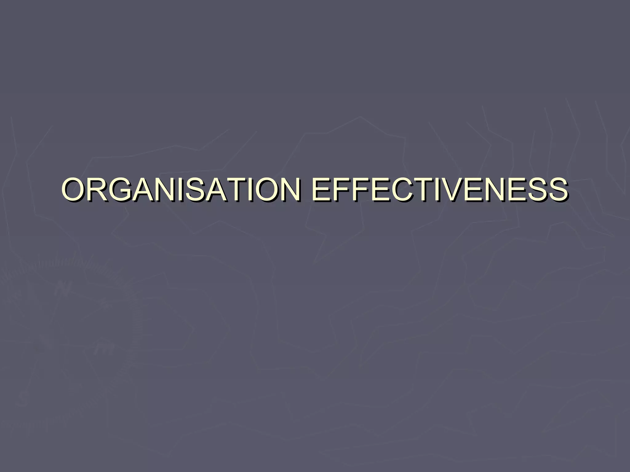 Organisational effectiveness outlines definitions, differences between effectiveness and efficiency, importance of measuring effectiveness, and theories of effectiveness. Effectiveness is defined as an organisation achieving its goals using resources efficiently. Effectiveness reflects external goals achieved, while efficiency means internal cost to achieve goals. Theories include goal approaches measuring goal achievement, strategic constituencies approach considering environmental transactions, and behavioural approach assessing goal integration of individuals and the organisation. High integration leads to individual goals aligning with organisational goals and highest effectiveness.