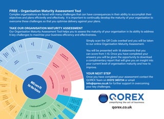 The document discusses the importance of maximizing financial performance and addressing challenges within healthcare organizations. It introduces an Organization Maturity Assessment Tool to help evaluate the maturity and effectiveness in overcoming these challenges. Users can scan a QR code to access the assessment and receive a complimentary report with insights and improvement suggestions.