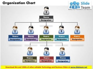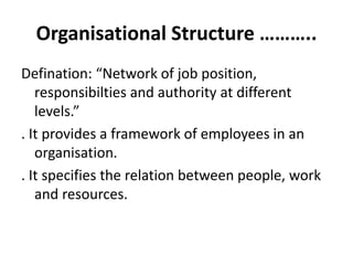 Organizational structure is defined as the network of job positions, responsibilities, and lines of authority within an organization. An organizational structure provides a framework for employees and specifies the relationship between people, work, and resources. The key factors that determine an organization's structure are job design, departmentalization, span of management, and delegation of authority. Organizational structures are typically functional, divisional, or some hybrid of the two.