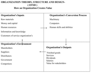 The document discusses organizational theory, structure, and design. It covers how organizations create value through their inputs, conversion processes, and outputs. It also discusses factors that affect organizational structure like strategy, size, technology, and environment. Different types of organizational structures are explained like functional, divisional, and matrix structures. Concepts like centralization, formalization, bureaucracy, and self-directed teams are also summarized.