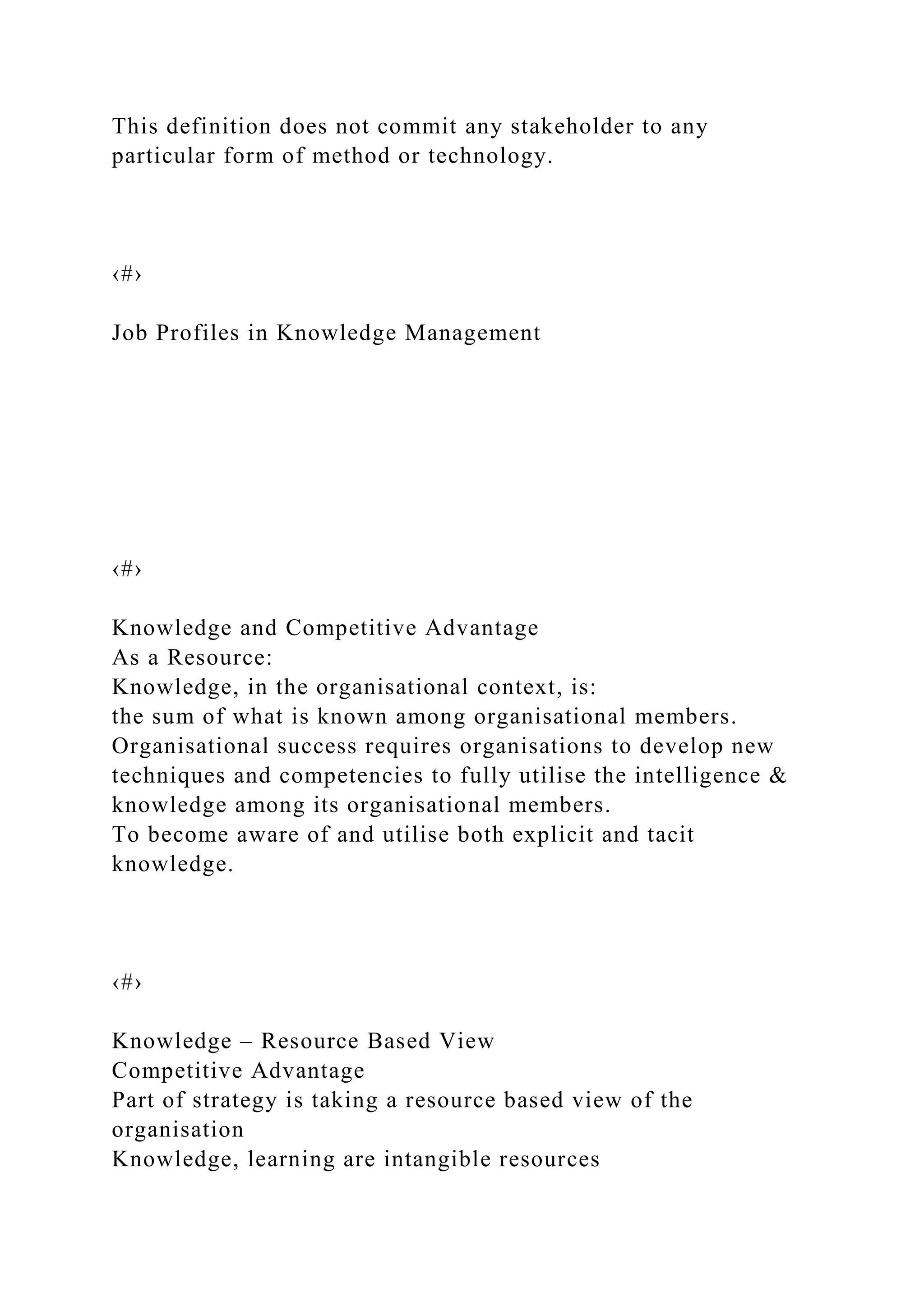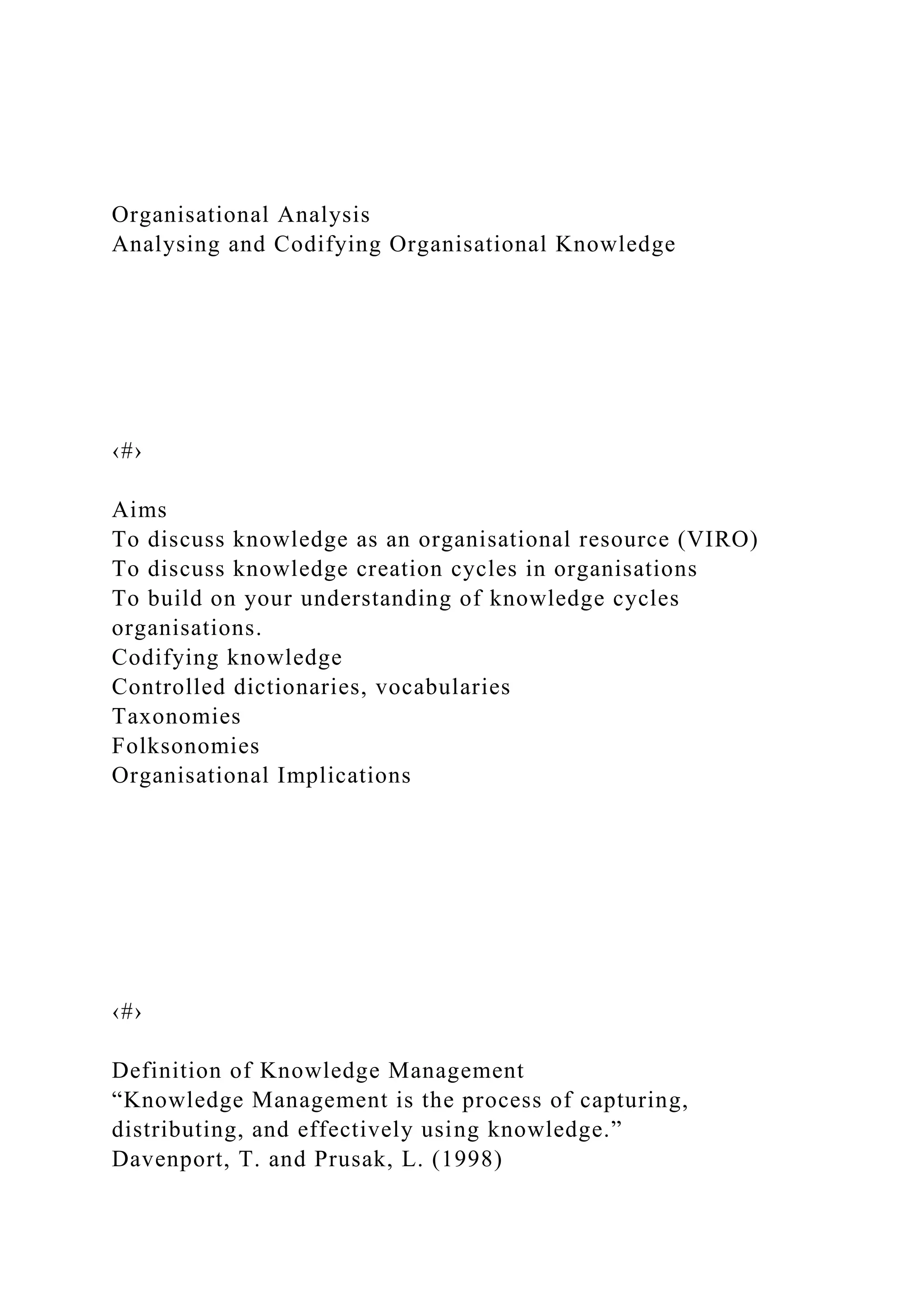 The document discusses the importance of knowledge management as an organizational resource, examining both explicit and tacit knowledge and their impact on creating competitive advantage. It outlines various challenges in knowledge management, including system integration, knowledge loss, and the need for codification techniques, while emphasizing the social processes behind knowledge creation. Additionally, the text delves into critical organizational analysis and power dynamics, highlighting the role of social interactions and narratives in shaping organizational behavior.