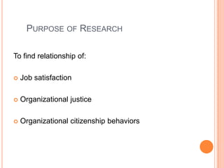 This document summarizes an organizational behavior final project submitted by five students. The project examines the relationship between job satisfaction, organizational justice, and organizational citizenship behaviors. It studies these relationships in both the private sector (Crescent Bahuman LTD) and public sector (Pakistan International Airline). The methodology section indicates that questionnaires will be used to collect data from 40 respondents across both sectors. Findings sections present data on levels of job satisfaction, organizational justice (distributive, procedural, interactional), and citizenship behaviors (interpersonal help, initiative, loyalty) for both the private and public sectors.
