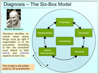 This document discusses organizational development techniques and their applications. It defines organizational development as a planned, organization-wide process to improve communication, problem-solving, and learning through behavioral science. Some key organizational development techniques mentioned include diagnostic activities, team building, survey feedback, education, and coaching/counseling. Diagnostic activities assess characteristics of the organization through surveys and interviews. Team building enhances group effectiveness. Survey feedback measures employee perceptions. Education focuses on sensitivity skills. Coaching/counseling provides non-evaluative feedback to help employees develop. The document also discusses when an organization is ready for development and some potential applications of organizational development.