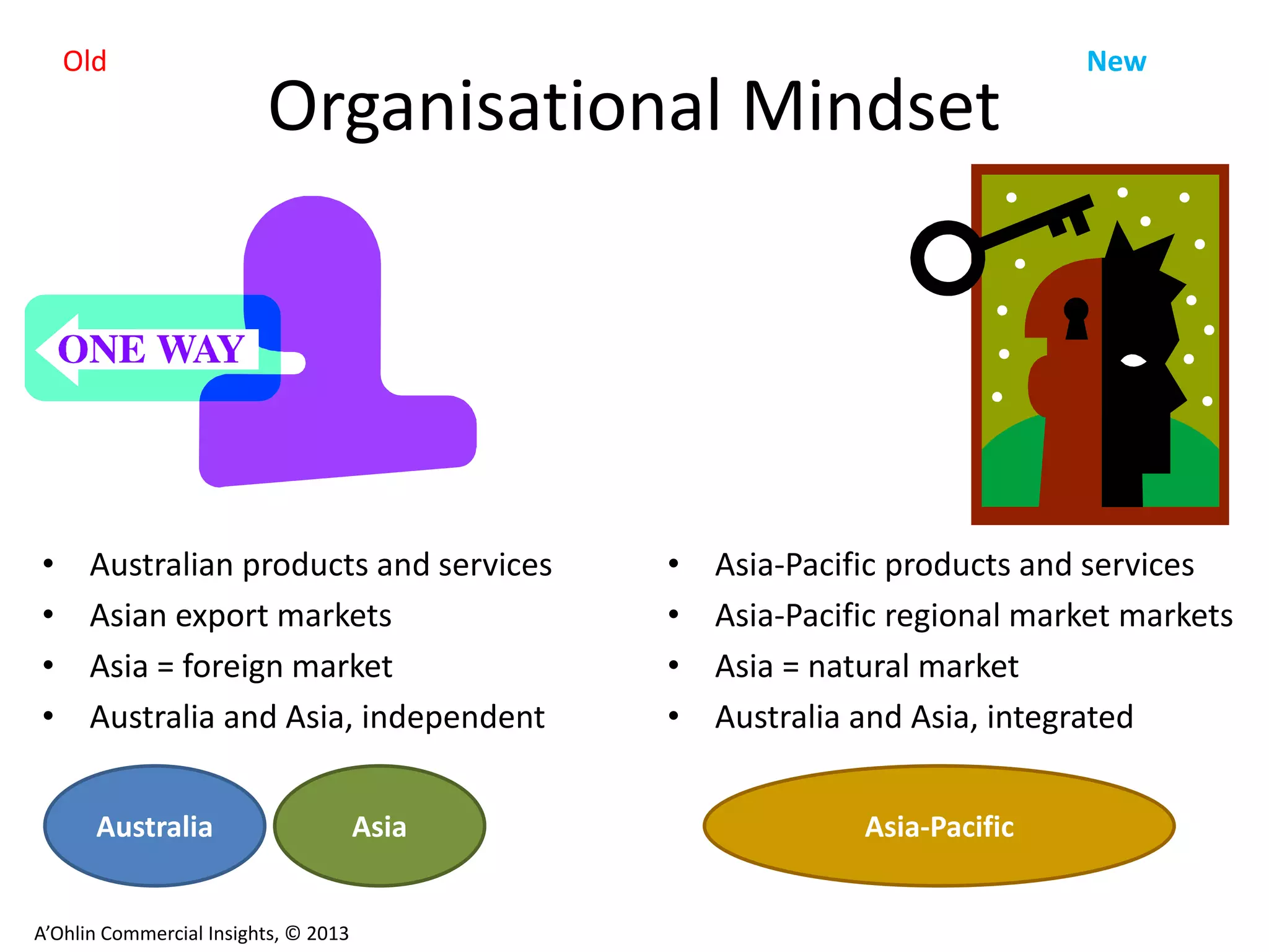 This document outlines two different organizational mindsets - an "old" view that sees Asia as a foreign export market for Australian products and services, with Australia and Asia operating independently. The "new" mindset sees the Asia-Pacific region as an integrated market, where Asia-Pacific products and services are sold in regional Asia-Pacific markets, and Asia is viewed as Australia's natural market with an integrated relationship.