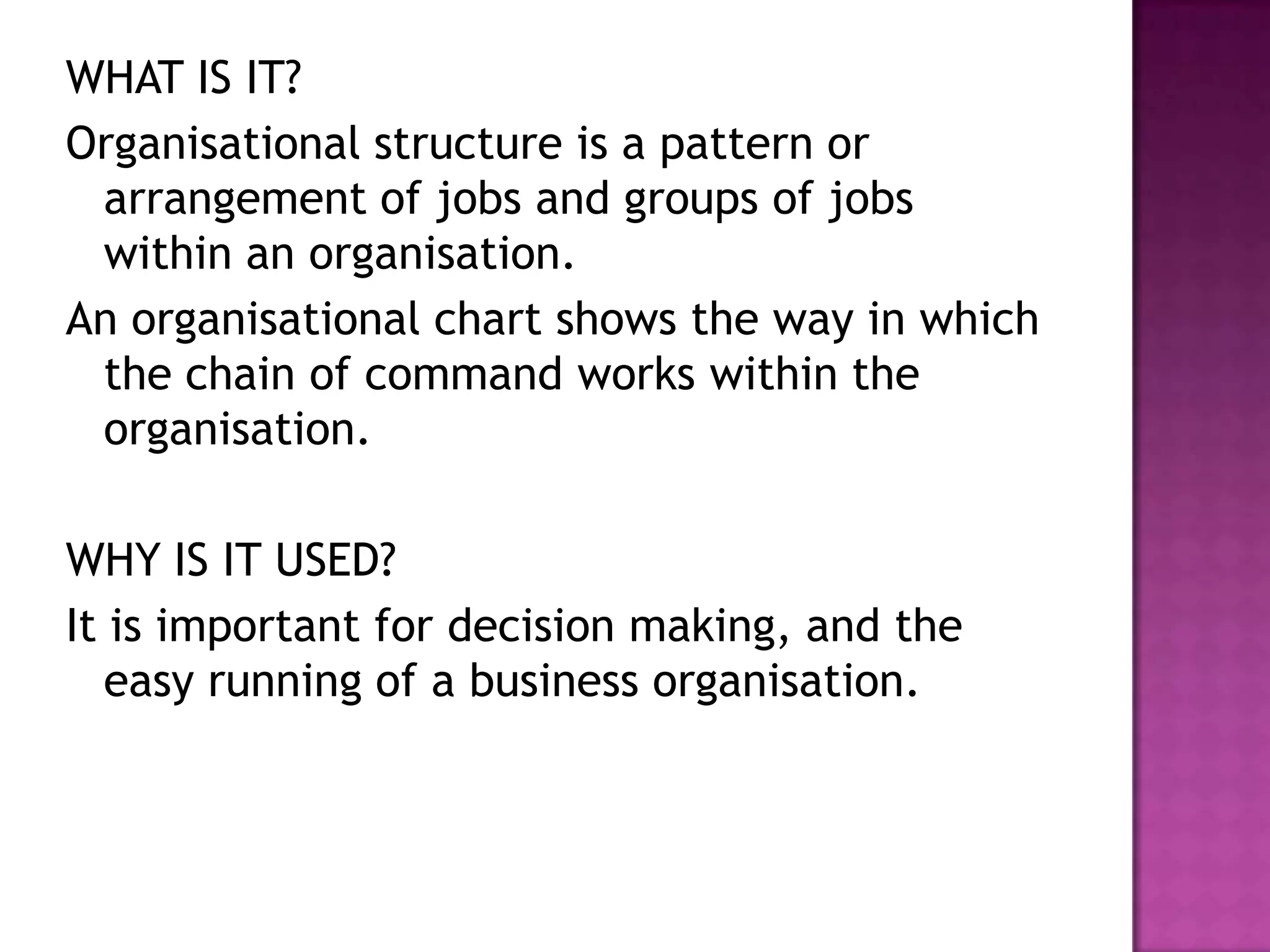 Organisational structure refers to the arrangement of jobs and groups within a company. An organizational chart visually depicts reporting relationships and the chain of command. Organizational structure is important for decision making and smooth business operations, as it defines roles and status within the company. Common structures include flat, tall, matrix, and divisional structures, each with their own advantages and disadvantages related to communication, decision making, and adaptability.