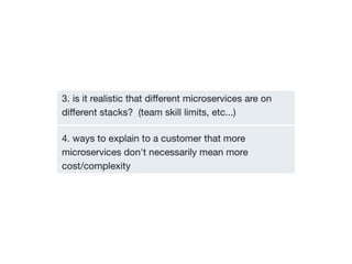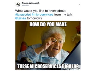 The document discusses the organization of JavaScript microservices and various tools and practices to maintain order in development, such as ES6 features, Babel, and Git hooks. It highlights the importance of consistency alongside the inevitable diversity in services, and mentions specific services like the Smiley app and various monitoring and security tools. Additionally, it includes helpful links and notes on a presentation at Agile Africa 2017.